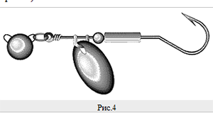 Шаг четвертый: Добавляем небольшой шарик-подшипник, монтируем металлическую дужку с блестящим лепестком и связываем конец проволоки аккуратной петелькой. Далее прочно присоединяем получившуюся конструкцию к основному грузилу посредством надежного заводного кольца (рисунок 4).