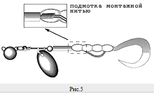 Шаг пятый: Специальной ниткой формируем уплотнение на поверхности цевья крючка, затем наносим слой защитного лака для долголетия вашего изделия. Наконец, надеваем аппетитную силиконку таким образом, чтобы спрятать острое жало внутрь нежного тела приманки (рисунок 5).